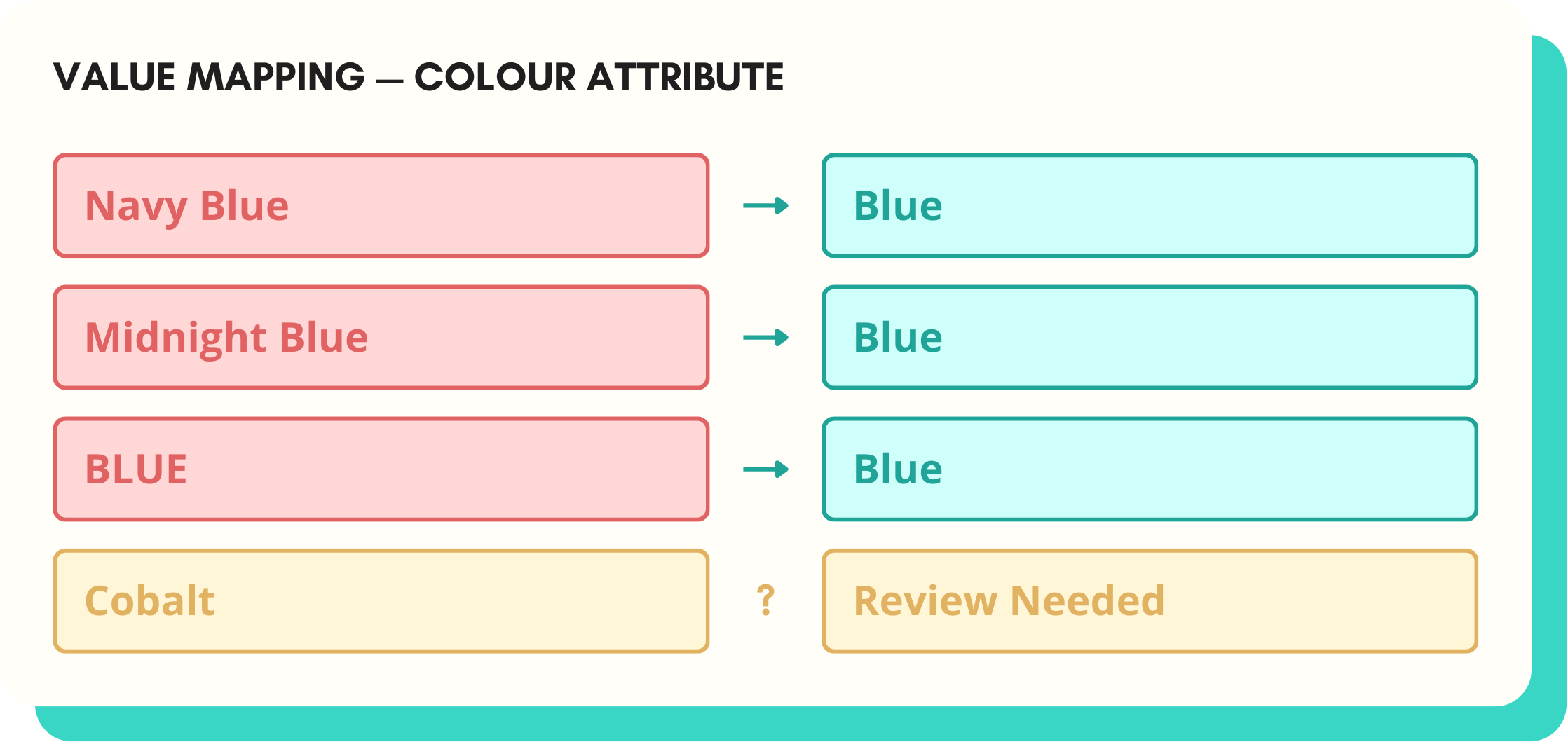 "Blue", "BLUE", "Royal Blue" — AI maps value variants to your accepted list. Works across colours, statuses, sizes, and any other controlled vocabulary.