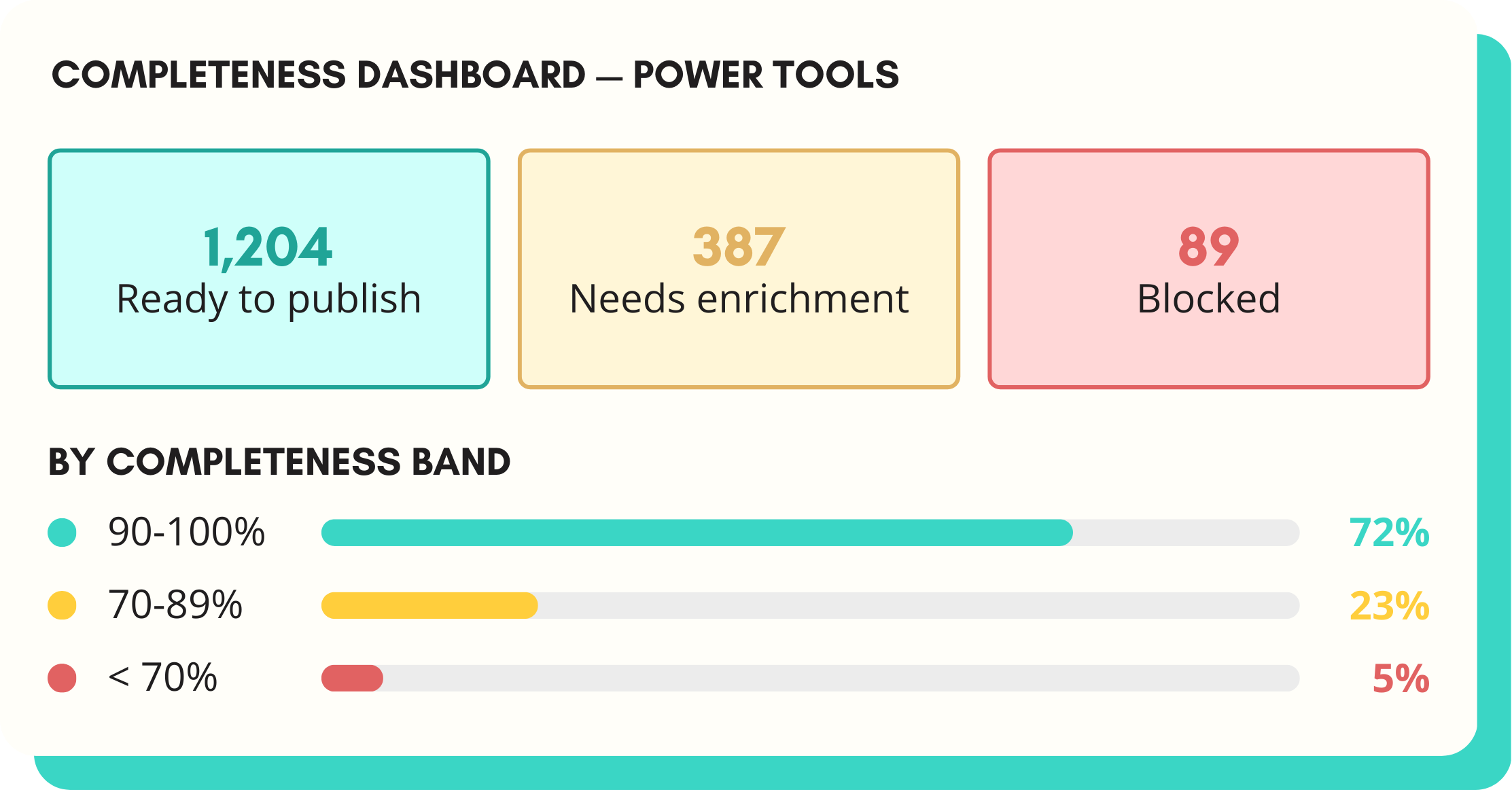 Set a completeness threshold — say, 90% — and only products that meet it are eligible for export to your PIM, ERP, or channels. No manual review of 10,000 rows. No incomplete products slipping through to your storefront.