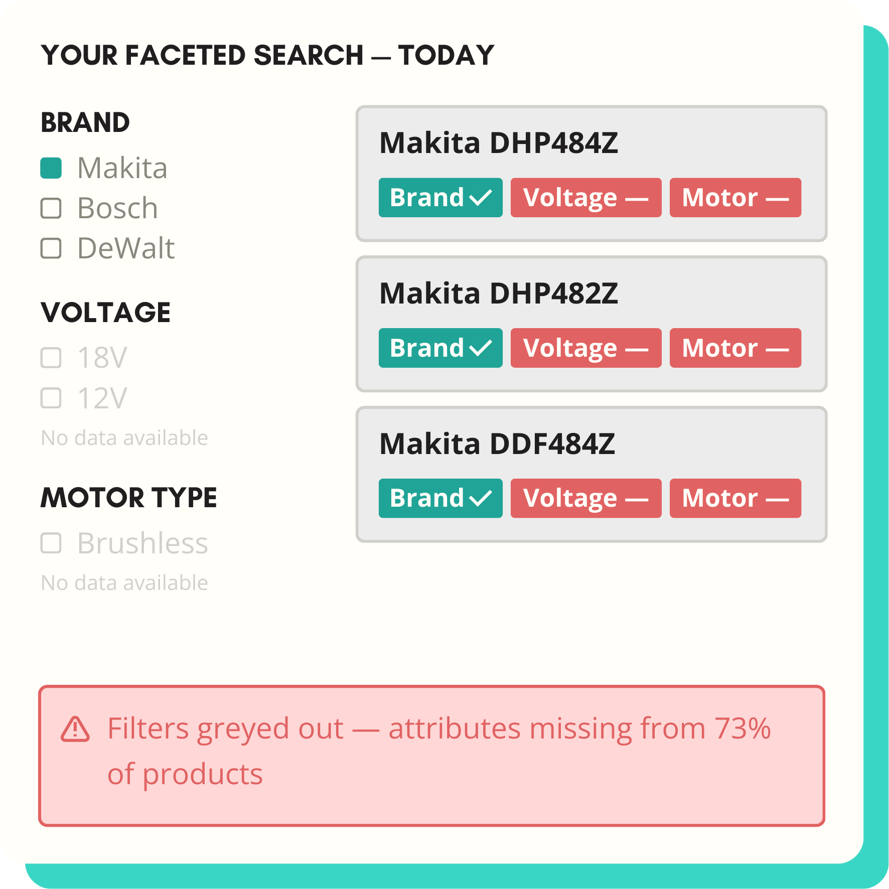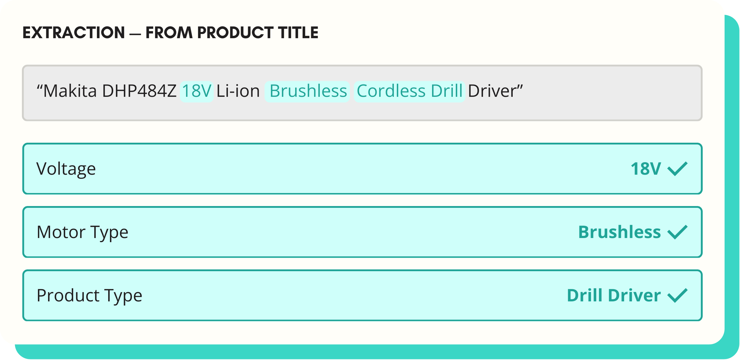 Look at your product titles. "Makita DHP484Z 18V Li-ion Brushless Cordless Drill Driver." Voltage: 18V. Motor type: brushless. Both attributes are sitting right there — in plain English, in the title — and neither of them is powering your faceted search. The data exists. It just wasn't extracted when the product was created.