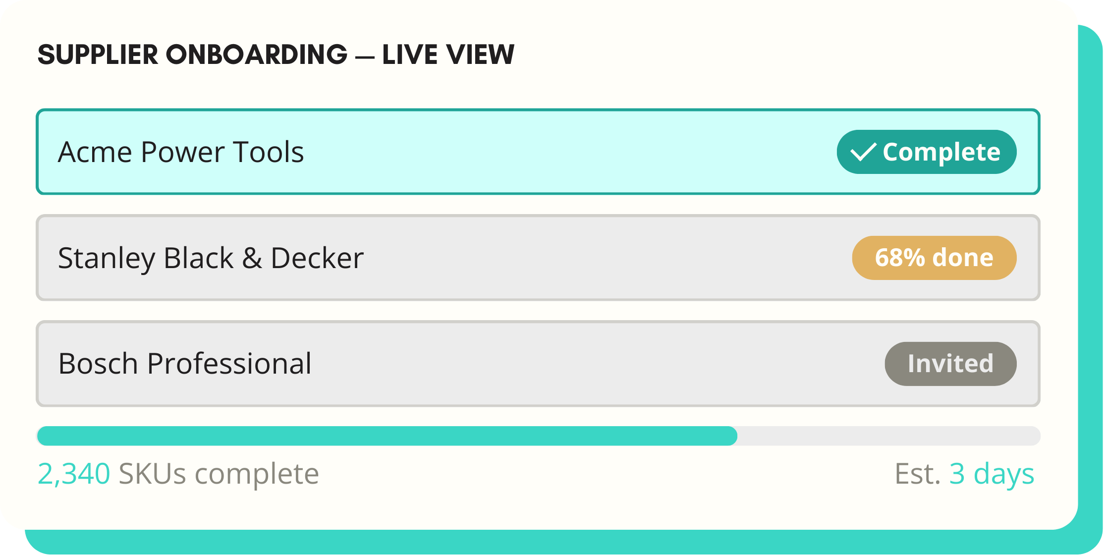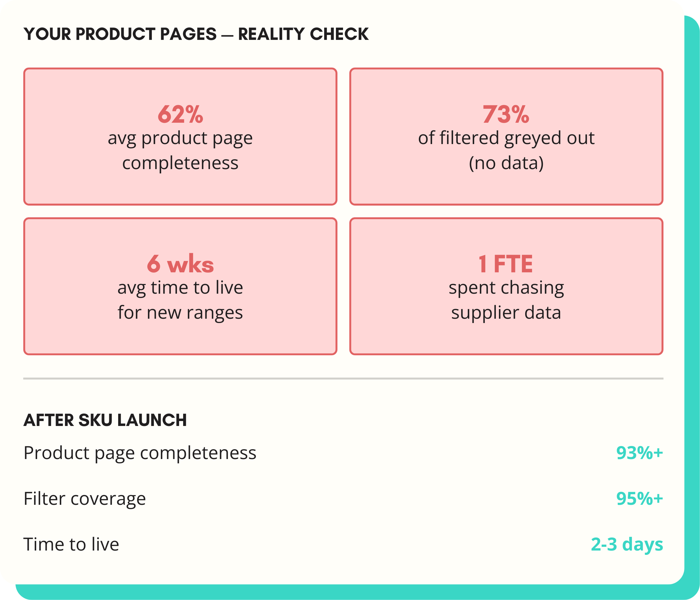 And the supplier problem compounds everything. You need data from 200 suppliers. Each one uses a different format. Each one sends back something different. Your team spends weeks cleaning it. The range goes live late. The competitor who had better supplier processes was live two weeks ago. Their products are ranking. Their products have reviews. You're still importing.